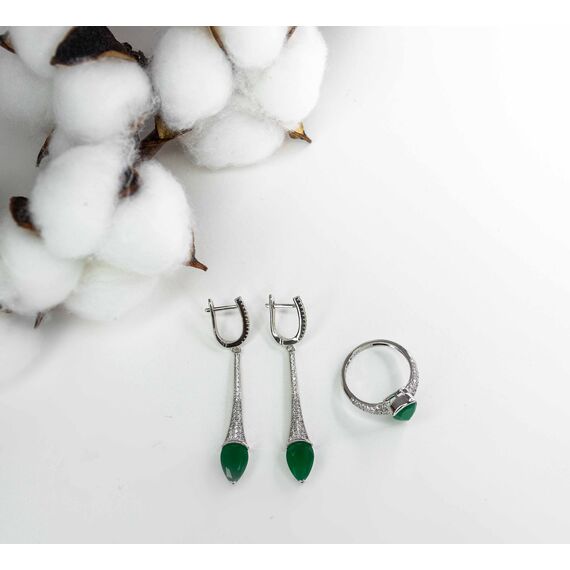Комплект ( серьги+кольцо) из гипоаллергенного ювелирного сплава серого цвета. Вставка- агат зеленого цвета и фианиты белого цвета. Высота серег-5,5см, ширина-0,8см. Английский замок (швенза-1см). Высота кольца-1,2см, ширина-2см. Размер кольца-19,0.