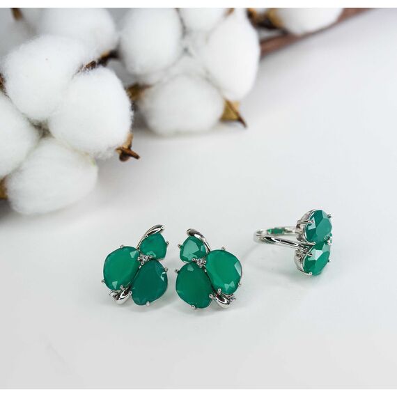 Комплект ( серьги+кольцо) из гипоаллергенного ювелирного сплава серого цвета. Вставка- агат зеленого цвета и фианиты белого цвета. Высота серег и кольца-2,5см, ширина-2см. Английский замок (швенза-1см). Размер кольца-18,0.