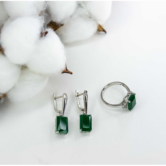 Серьги из гипоаллергенного ювелирного сплава серого цвета . Вставка- ювелирное стекло зеленого и белого цвета.Английский замок (швенза-1см). Высота серег-3см, ширина-1,8см. Кольцо-18,0.Высота кольца-1см, ширина-0,6см.
