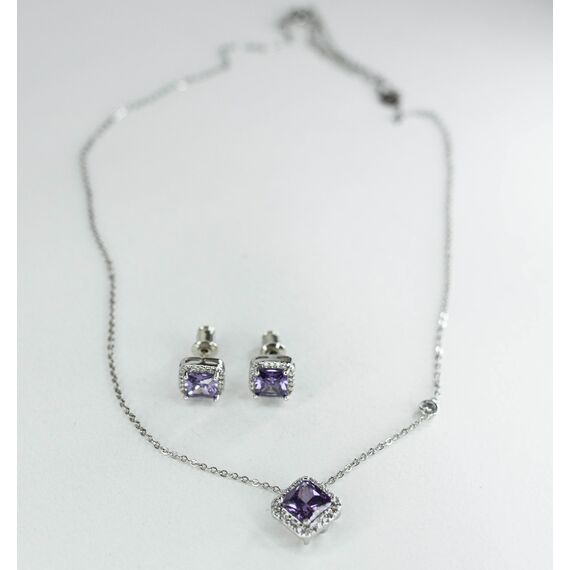Комплект (серьги+колье) женский из гипоаллергенного сплава серого цвета. Вставка- ювелирное стекло фиолетового и белого цвета. Высота серег- 1,0см, ширина- 1,0см. Замок- пусет. Длина цепи-45,0см с удлинением. Высота и ширина подвески-1,5см. Застежка у колье- карабин.