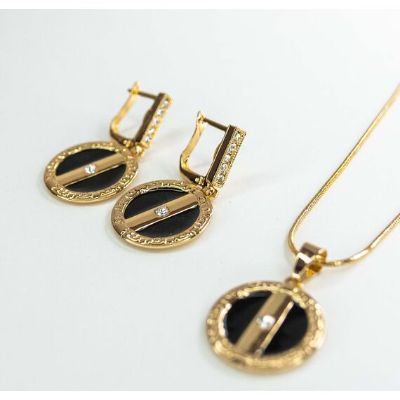 Комплект ( колье+ серьги) из гипоаллергенного ювелирного сплава желтого цвета. Покрытие эмалью, цвет- черный. Вставка- ювелирное стекло белого цвета. Высота серег--3,5см, ширина-2см. Застежка- английская( швенза-1см). Высота подвески-3см, ширина-2см. Длина цепи( снейк)-45,0+5см. Замок-карабин.
