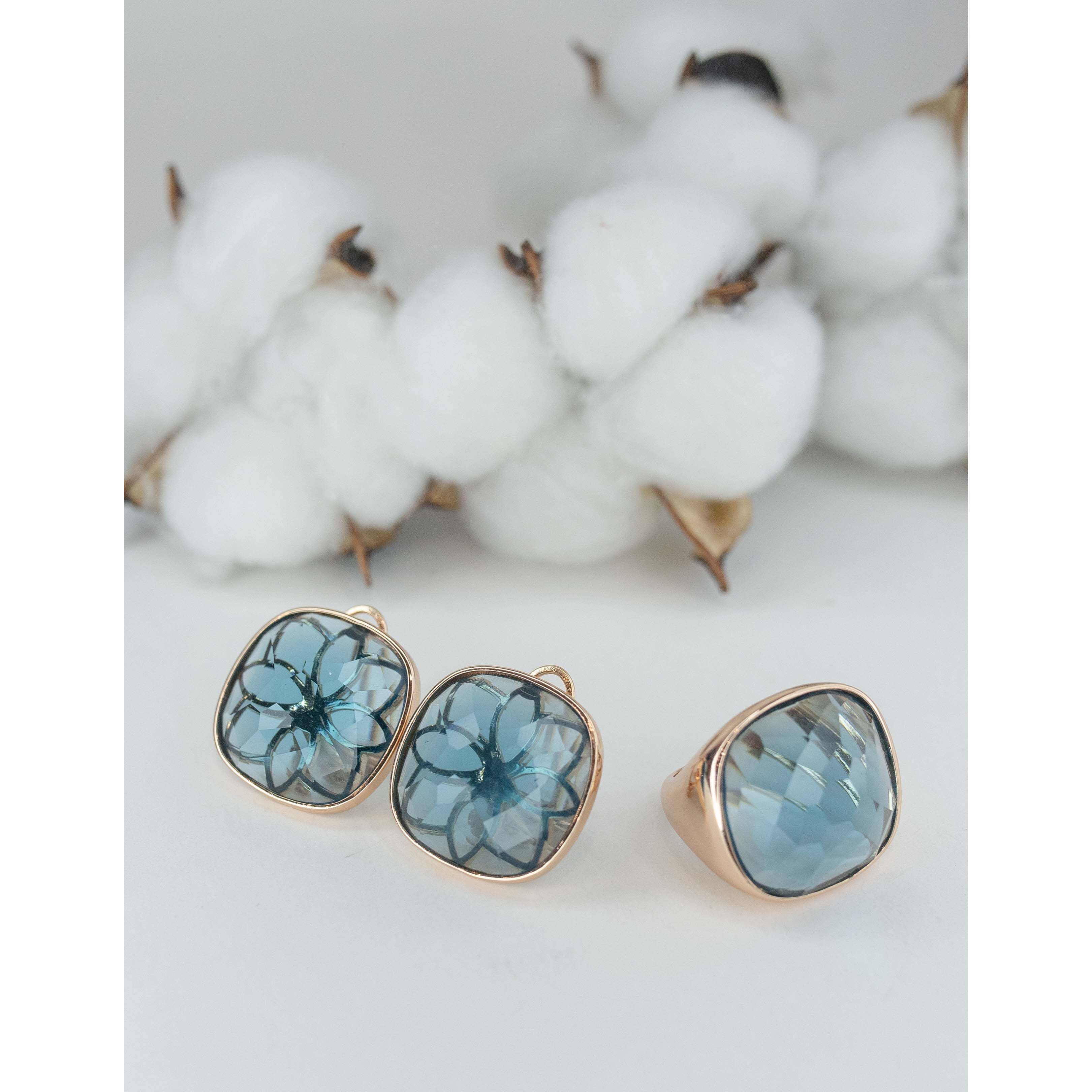 Комплект (серьги+кольцо) из гипоаллергенного ювелирного сплава желтого цвета. Вставка- ювелирное стекло голубого цвета. Высота серег- 2,0см, ширина- 2,0см. Английский замок ( штифт- 1,0см). Высота кольца- 2,0см, ширина- 2,0см. Размер- 19,0.