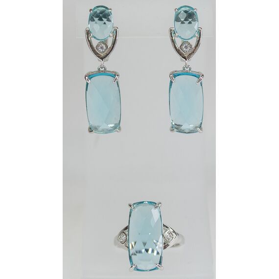 Комплект (серьги+кольцо) женский из гипоаллергенного сплава серого цвета. Вставка- ювелирное стекло голубого цвета. Высота серег- 4,5см, ширина- 1,2см. Английский замок ( штифт-1,0см). Высота кольца- 2,0см, ширина- 1,2см. Размер-18,0.