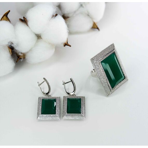 Серьги из гипоаллергенного ювелирного сплава серого цвета . Вставка- ювелирное стекло зеленого и белого цвета.Английский замок (швенза-1см). Высота серег-4,5см, ширина-2см. Кольцо-19,0, высота кольца-4см, ширина-3см.