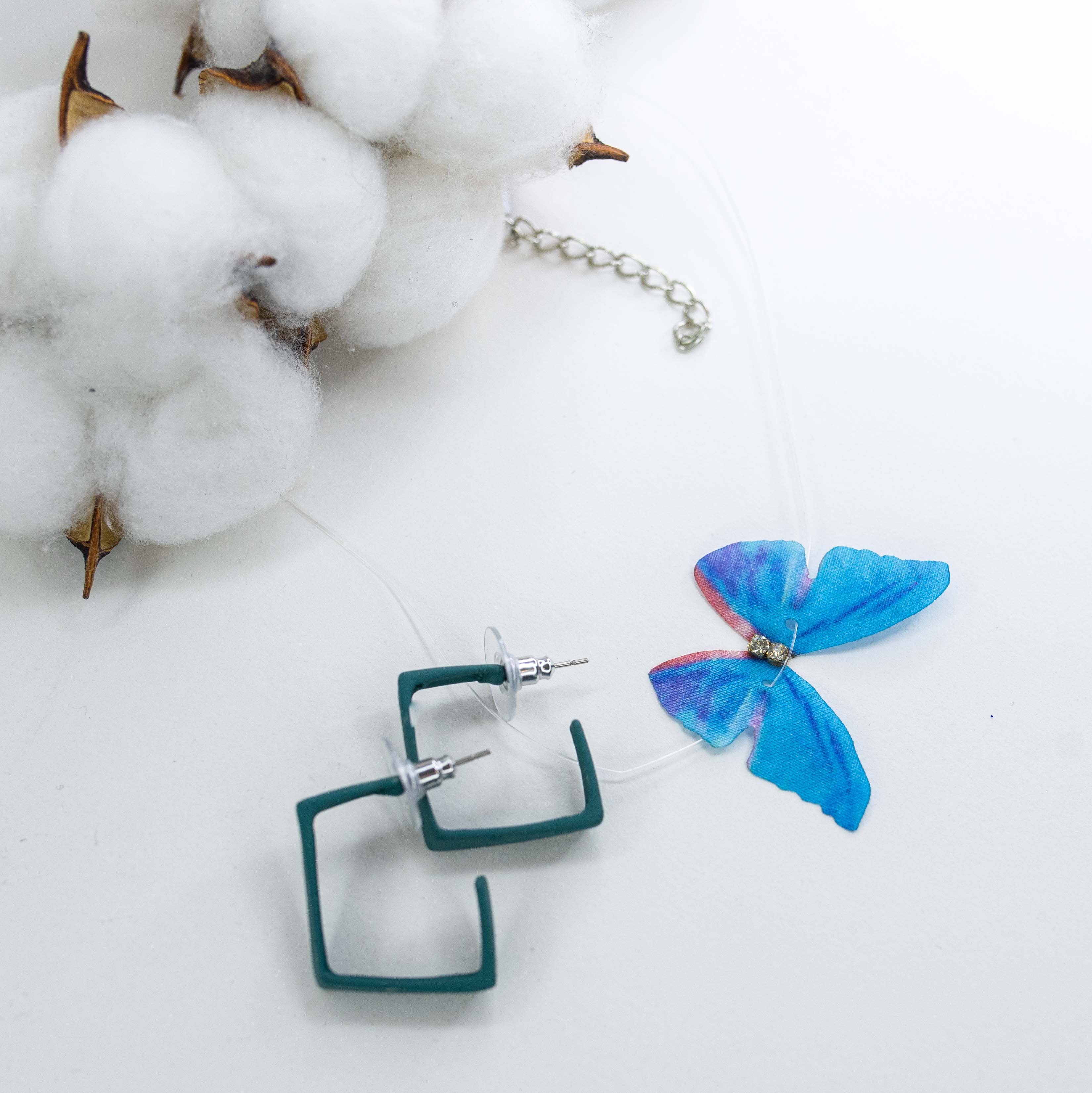 Комплект (колье+серьги) из гипоаллергенного ювелирного сплава. Колье состоит из лески белого цвета и подвески из текстиля, цвет- голубой. Вставка- ювелирное стекло белого цвета. Размер колье-35,0см. Серьги изготовлены из ювелирного пластика зеленого цвета. Высота серег-2,5см, ширина-0,5см. Застежка- пусет.