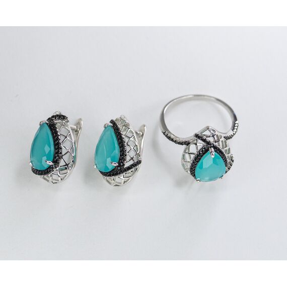 Комплект (серьги+кольцо) из гипоаллергенного ювелирного сплава серого цвета. Вставка- кварц черного и зеленого цвета. Высота серег и кольца-2см, ширина-1,3см. В серьгах английский замок. Кольцо-18,0.
