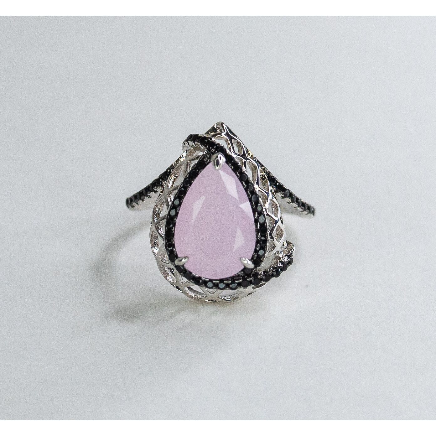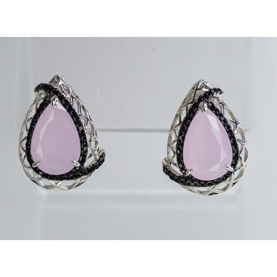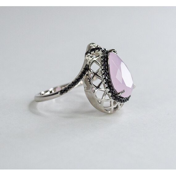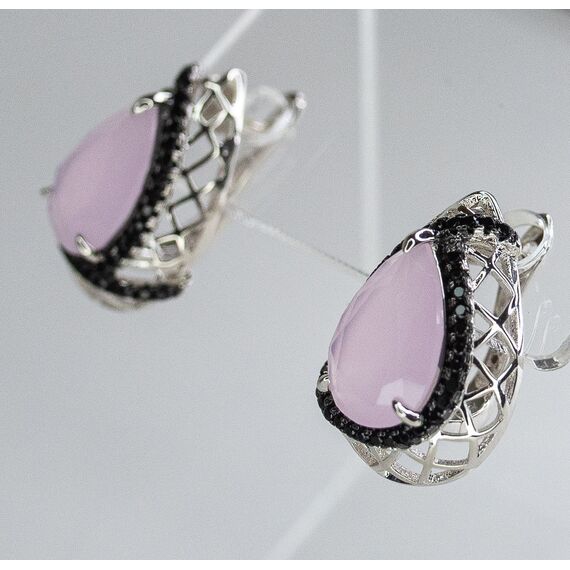 Комплект (серьги+кольцо) из гипоаллергенного ювелирного сплава серого цвета. Вставка- кварц черного и розового цвета. Высота серег и кольца-2см, ширина-1,3см. В серьгах английский замок. Кольцо-17,0.