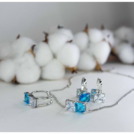 Комплект (кольцо+серьги+ колье) из гипоаллергенного ювелирного сплава серого цвета. Вставка- ювелирное стекло белого и голубого цвета. Высота серег-2см, ширина-1см. Кольцо- незамкнутое ( безразмерное), высота-1см, ширина-1,5см. Длина колье- 40,0+5см. Замок- карабин.