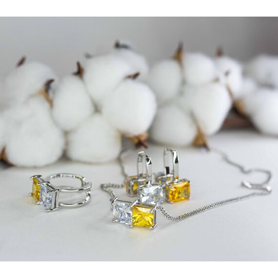 Комплект (кольцо+серьги+ колье) из гипоаллергенного ювелирного сплава серого цвета. Вставка- ювелирное стекло белого и желтого цвета. Высота серег-2см, ширина-1см. Кольцо- незамкнутое ( безразмерное), высота-1см, ширина-1,5см. Длина колье- 40,0+5см. Замок- карабин.