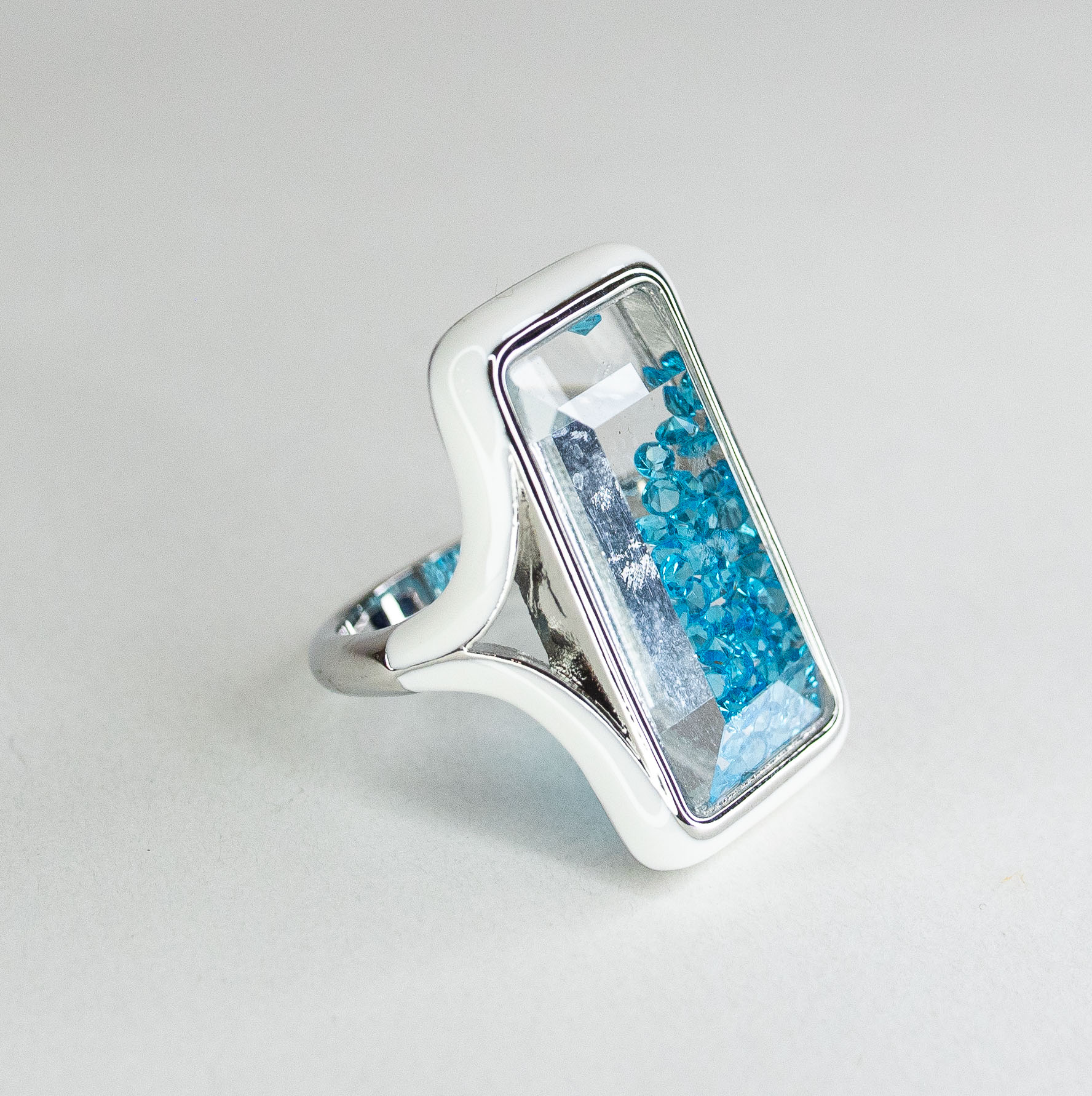 Комплект ( серьги+кольцо) из гипоаллергенного ювелирного сплава серого цвета. Покрытие эмалью белого цвета. Вставка- прозрачное ювелирное стекло и цирконы голубого цвета россыпью. Высота серег-2см, ширина-1см. Английский замок ( швенза-1см). Высота кольца-3см, ширина-1,6см.Размер-18,0.