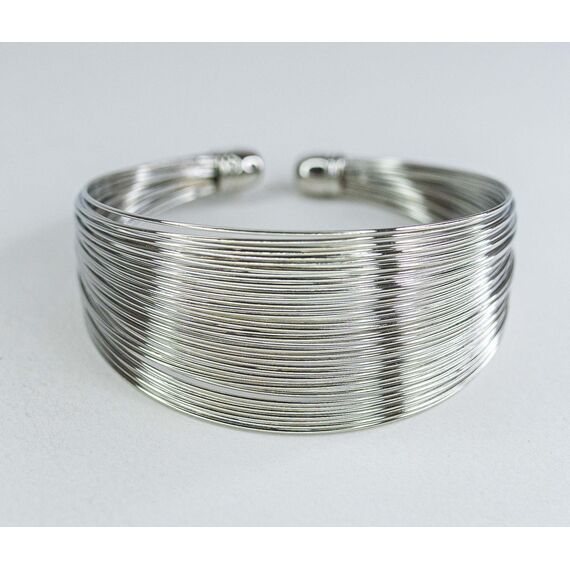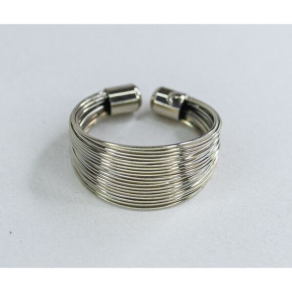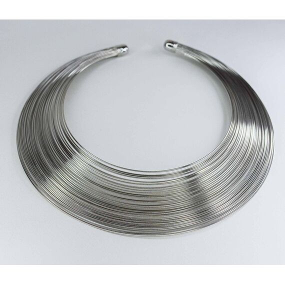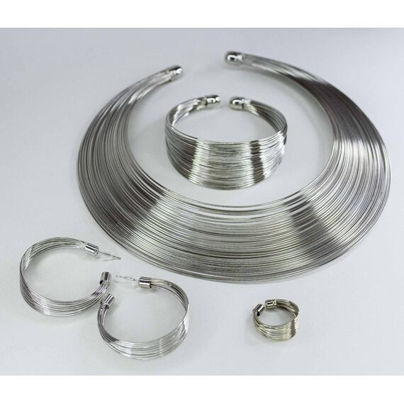 Комплект (колье+браслет+серьги+кольцо) из гипоаллергенного ювелирного сплава серого цвета. Без вставок. В комплекте все изделия- жесткие, из негнущихся, металлических, незамкнутых обручей, закрепленных на концах в шарик. Высота колье-5,0см, браслета-3,5см, серег-2,0см, кольца-2,0см. Застежка у серег- пусет. Кольцо и браслет -безразмерные. Длина колье-50,0см.