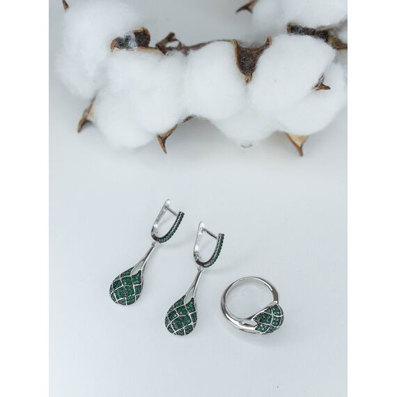 Комплект (серьги+кольцо) из гипоаллергенного ювелирного сплава серого цвета. Вставка- циркон, цвет- зеленый и черный. Высота серег--4,0см, ширина-1,3см. Застежка- английская (швенза-1,0см). Высота кольца-1,3см, ширина-2,0см. Размер-17,0.