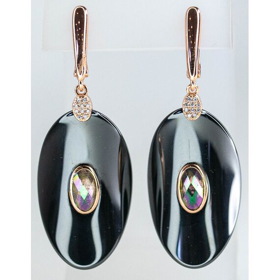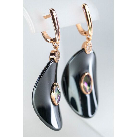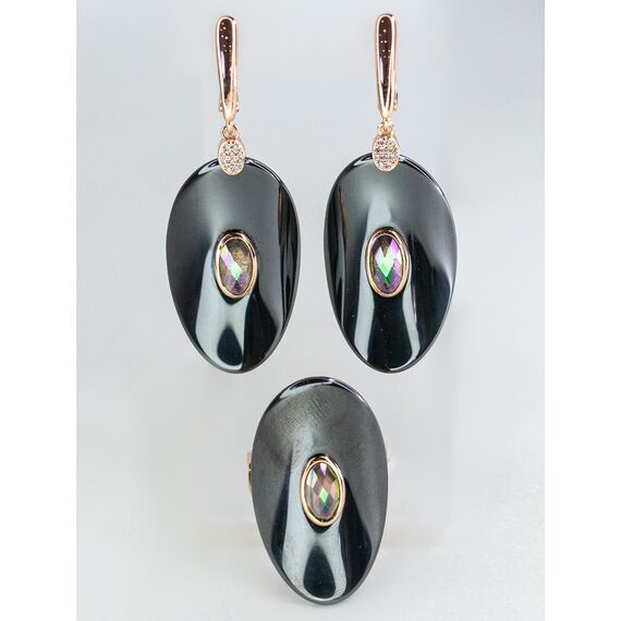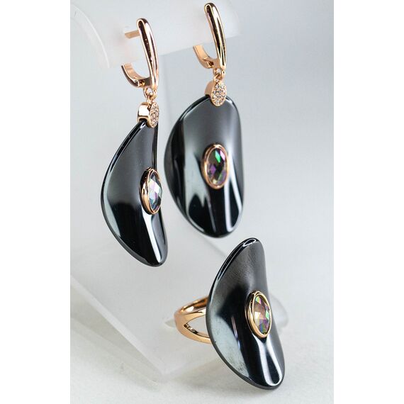 Комплект (серьги+кольцо) из гипоаллергенного ювелирного сплава желтого цвета. Вставка- керамика, цвет-черный и ювелирное стекло белого цвета. Высота серег-6,0см, ширина-2,0см. Английский замок (швенза-1,0см). Высота кольца-3,0см, ширина-2,0см. Размер-18,0.