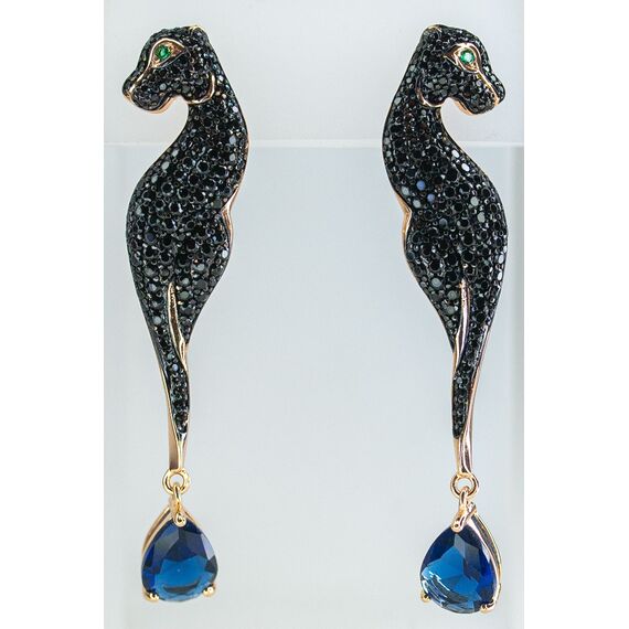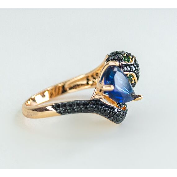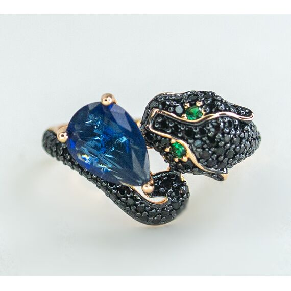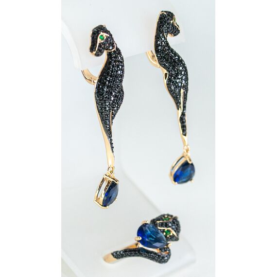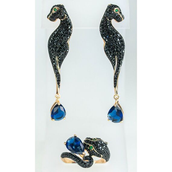 Комплект (серьги+кольцо) из гипоаллергенного ювелирного сплава желтого цвета. Вставка- кварц, цвет-синий и цирконы черного цвета. Высота серег-5,0см, ширина-1,0см. Английский замок (швенза-1,0см). Высота кольца-1,5см, ширина-2,0см. Размер-18,0.