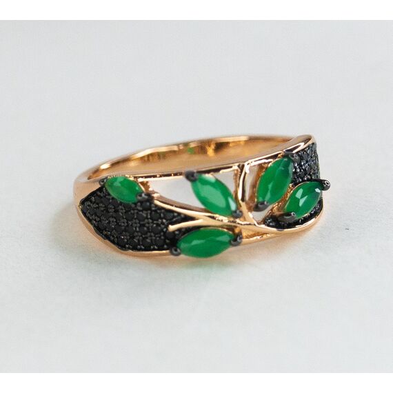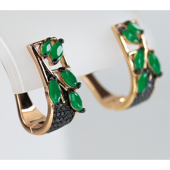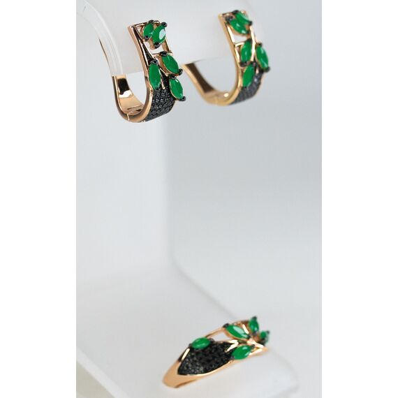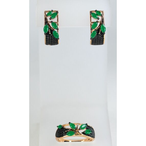 Комплект (серьги+кольцо) из гипоаллергенного ювелирного сплава желтого цвета. Вставка- агат, цвет- зеленый и фианит черного цвета. Высота серег-2,0см, ширина-1,0см. Английский замок (швенза-1,0см). Высота кольца-1,0см, ширина-2,0см. Размер-17,0.