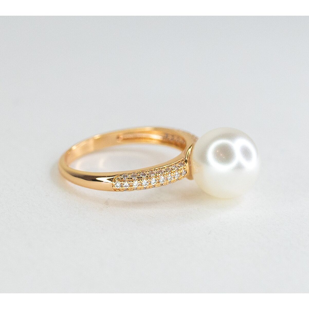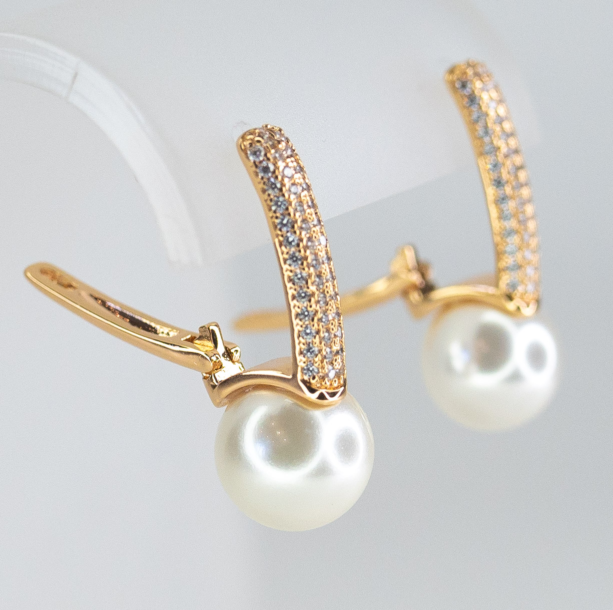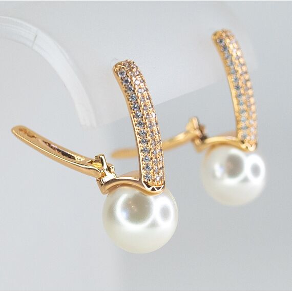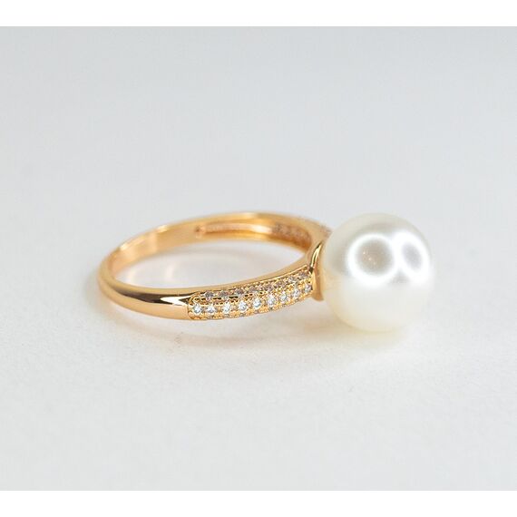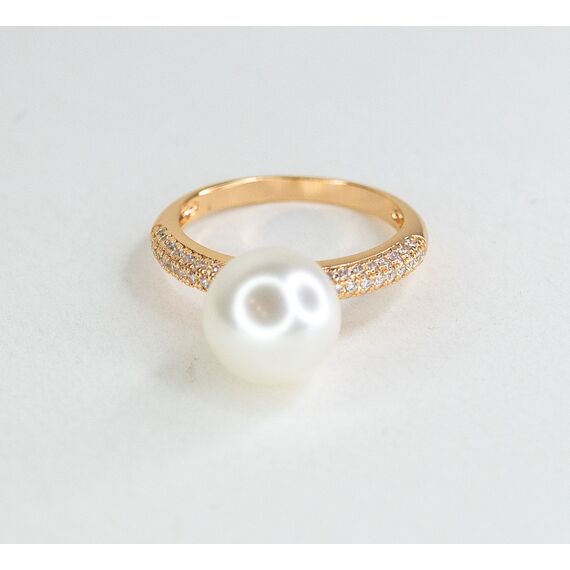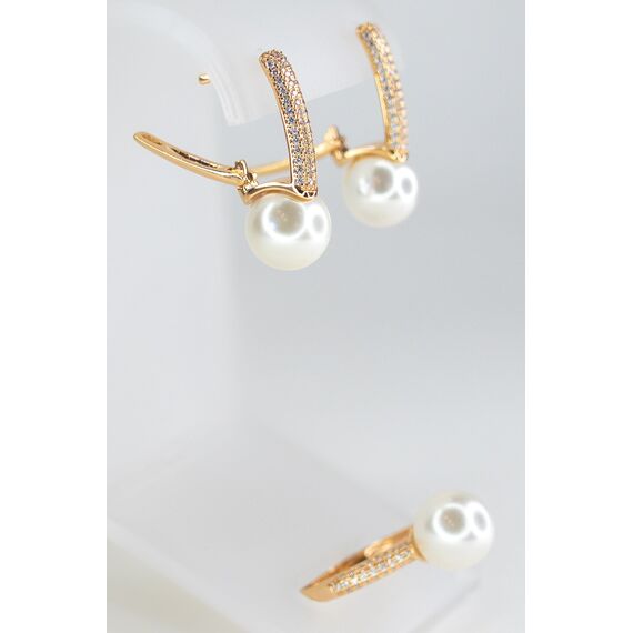 Комплект (серьги+кольцо) из гипоаллергенного ювелирного сплава желтого цвета. Вставка- жемчуг, цвет- белый и ювелирное стекло белого цвета. Высота серег-3,0см, ширина-1,0см. Застежка- английская (швенза-1,0см). Высота кольца-1,0см, ширина-2,0см. Размер-17,0.