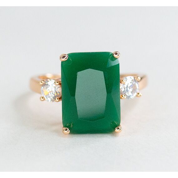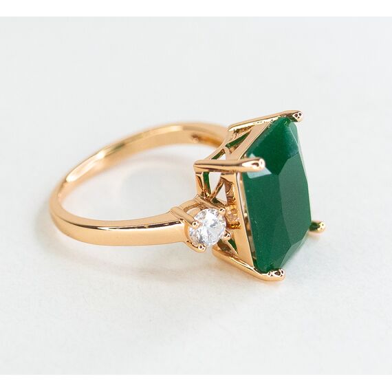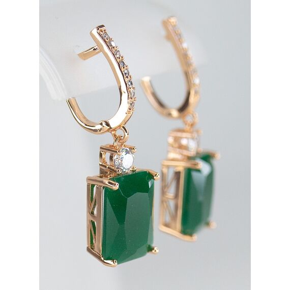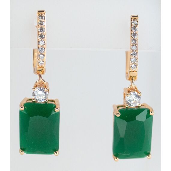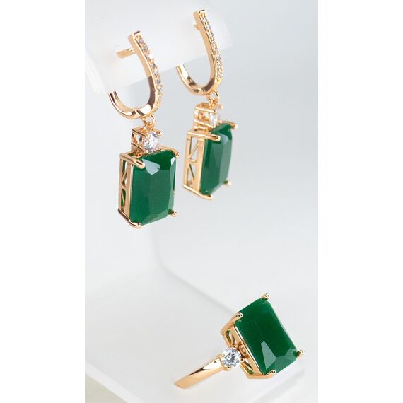 Комплект (серьги+кольцо) из гипоаллергенного ювелирного сплава желтого цвета. Вставка- агат, цвет- зеленый и фианит белого цвета. Высота серег-4,0см, ширина-1,2см. Застежка- английская (швенза-1,0см). Высота кольца-1,5см, ширина-2,0см. Размер-18,0.