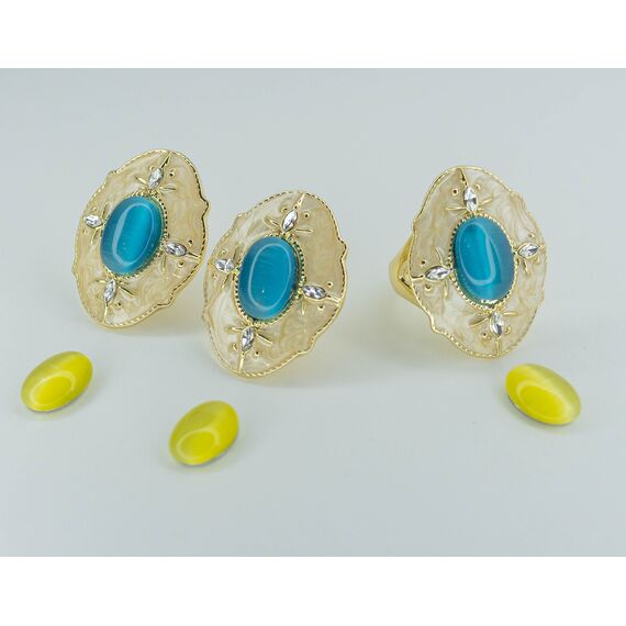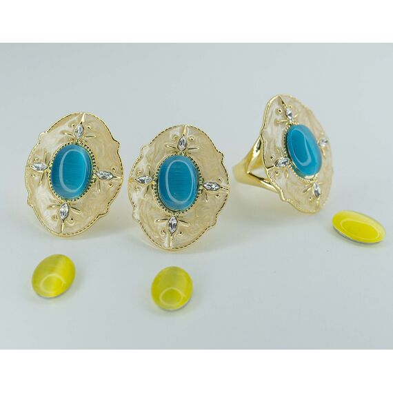 Серьги женские из гипоаллергенного ювелирного сплава желтого цвета. Вставка- ювелирное стекло, цвет- белый и улексит желтого и голубого цвета. Высота кольца и серег- 3,0см, ширина-2,0см. Застежка- итальянская (штифт-1,2см и клипса). Размер кольца-18,0.