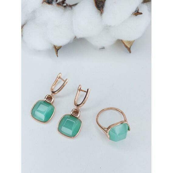 Комплект (серьги+кольцо) из гипоаллергенного ювелирного сплава желтого цвета. Вставка -улексит (кошачий глаз) зеленого цвета. Высота серег-3,5см, ширина-1,5см. Английский замок (штифт-1,0см). Высота кольца-1,5см, ширина-1,5см. Размер-19,0.
