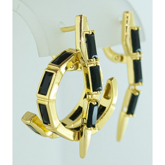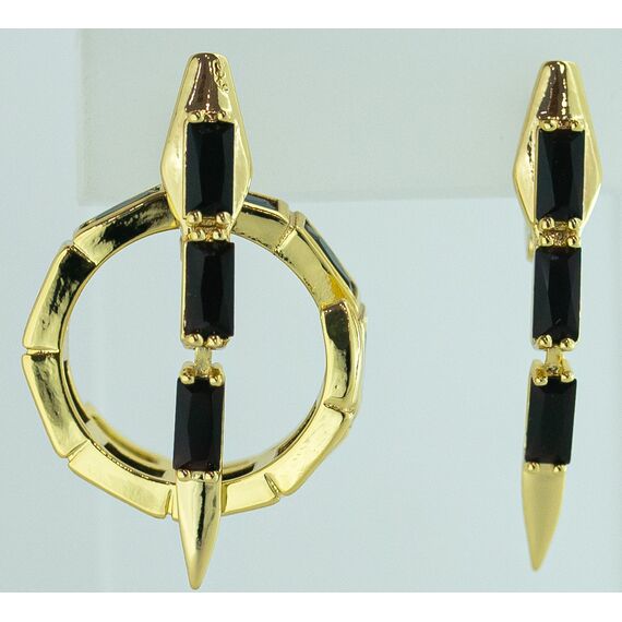 Комплект (серьги+кольцо) из гипоаллергенного ювелирного сплава желтого цвета. Вставка- ювелирное стекло черного цвета. Высота серег- 3,0см., ширина-0,5см. Застежка- английская. Высота кольца-1,0см, ширина-2,0см. Кольцо незамкнутое, безразмерное.