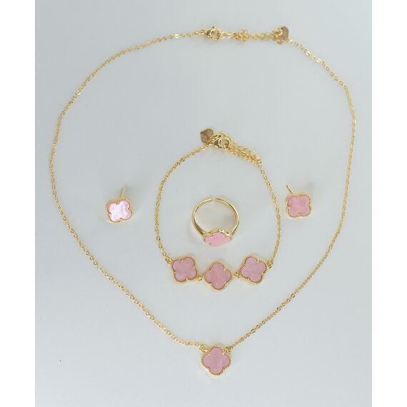 Комплект ( колье+браслет+серьги+кольцо) из гипоаллергенного ювелирного сплава желтого цвета. Покрытие перламутром розового цвета. Размер браслета-18,0.,замок- карабин. Длина колье-45,0см, замок- карабин. Застежка у серег- английская ( штифт-1,0см). Кольцо безразмерное.