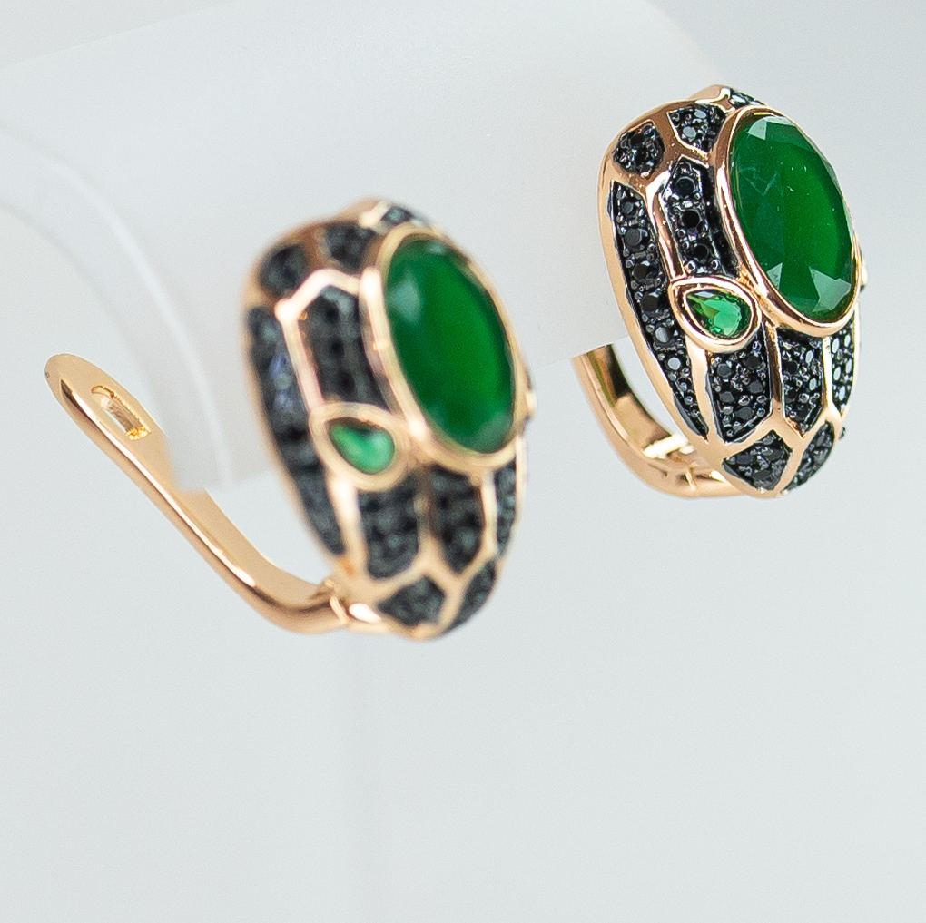 Комплект (серьги+кольцо+подвеска) из гипоаллергенного ювелирного сплава желтого цвета. Вставка- кварц, цвет-черный и зеленый. Высота серег-2,0см, ширина-1,5см, английский замок. Кольцо незамкнутое, высота-1,5см, ширина-2,0см, размер-19,0. Высота подвески-3,0см, ширина-2,0см.