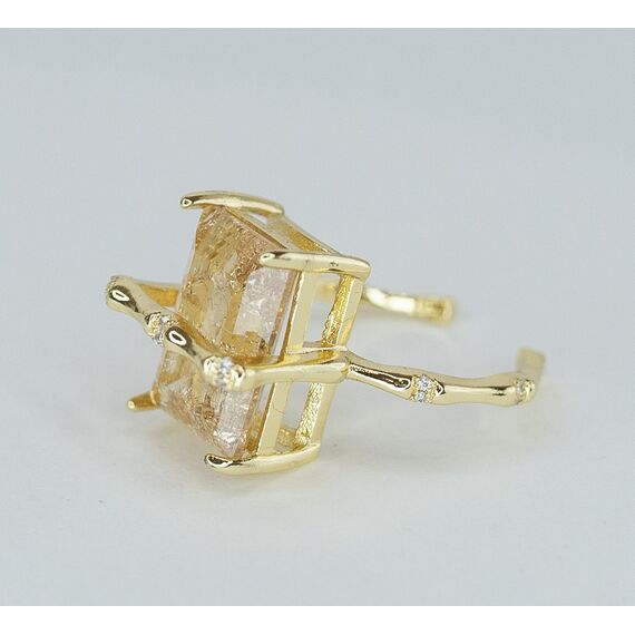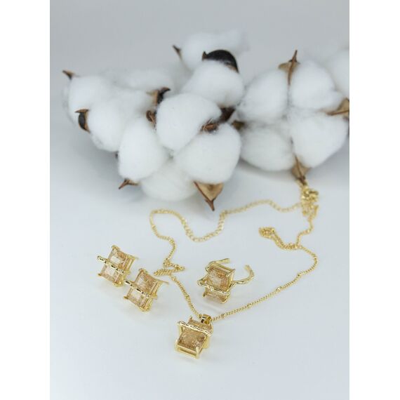 Комплект женский (цепь+подвеска+серьги+кольцо) из гипоаллергенного ювелирного сплава желтого цвета. Вставка- ювелирное стекло желтого цвета. Высота подвески, серег, кольца- 1,5см, ширина-1,0см. Длина цепи- 50,0см с удлинением, застежка- карабин. Замок у серег-английский ( штифт-1,0см). Кольцо незамкнутое, безразмерное.