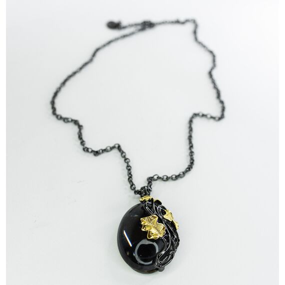Подвеска женская из гипоаллергенного ювелирного сплава черного и желтого цвета. Вставка- улексит( кошачий глаз) серого цвета. Высота подвески-5,5см, ширина-3см. Длина цепи-55,0+5см, плетение- Якорная.