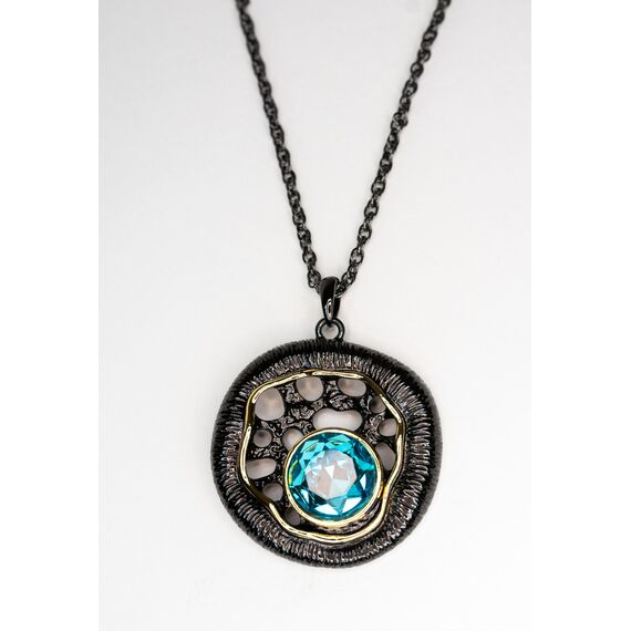 Подвеска из гипоаллергенного ювелирного сплава черного и желтого цвета. Вставка- ювелирное стекло ( диаметр камня-2см) ,цвет- голубой. Высота подвески-6см, ширина-4,5см.Длина цепи-55,0+7см, плетение- Кордовая.