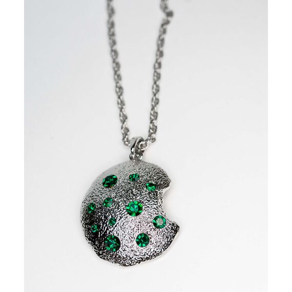 Подвеска из гипоаллергенного ювелирного сплава серого цвета . Вставка- ювелирное стекло зеленого цвета. Высота подвески-5см, ширина-3см. Длина цепи-50см+5, плетение- Кордовая.