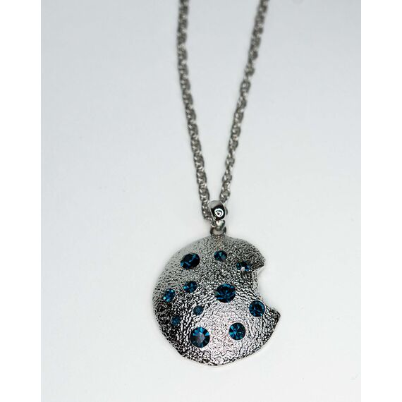 Подвеска из гипоаллергенного ювелирного сплава серого цвета . Вставка- ювелирное стекло синего цвета. Высота подвески-5см, ширина-3см. Длина цепи- 50см+5,плетение- Кордовая.