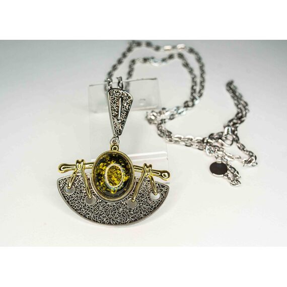 Подвеска из гипоаллергенного ювелирного сплава желтого и серого цвета . Вставка- янтарь, цвет- желтый. Высота подвески-7см, ширина-6см.Длина цепи- 80см +5, плетение- Якорная.