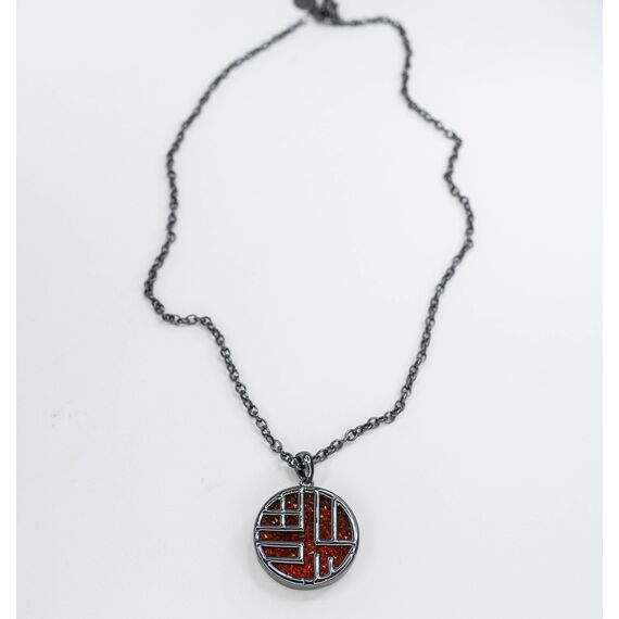 Подвеска (колье) из гипоаллергенного ювелирного сплава черного цвета. Вставка- ювелирное стекло красного цвета. Высота подвески-4,0см, ширина-3,0см. Длина цепи-55,0+5,0см, замок- карабин.