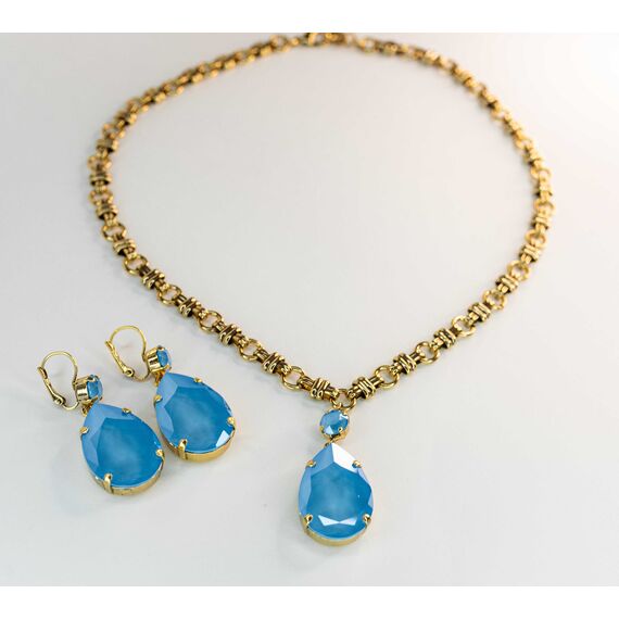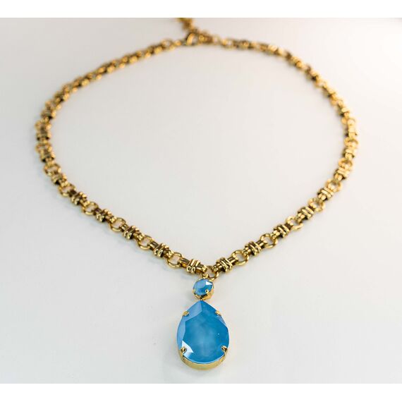 Подвеска (колье) из гипоаллергенного ювелирного сплава желтого цвета. Вставка- кварц, цвет- голубой. Высота подвески-3,5см, ширина-2,5см. Длина фантазийной цепи-50,0см, замок- карабин.