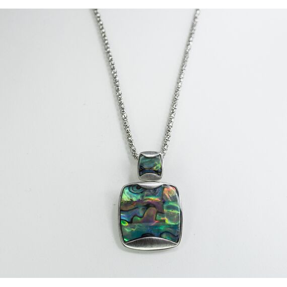 Подвеска из гипоаллергенного ювелирного сплава серого цвета. Вставка - гелиотис ( перламутр), цвет - микс. Высота подвески - 4,5см, ширина - 3см. Длина цепи фантазийного плетения - 55см + 5.