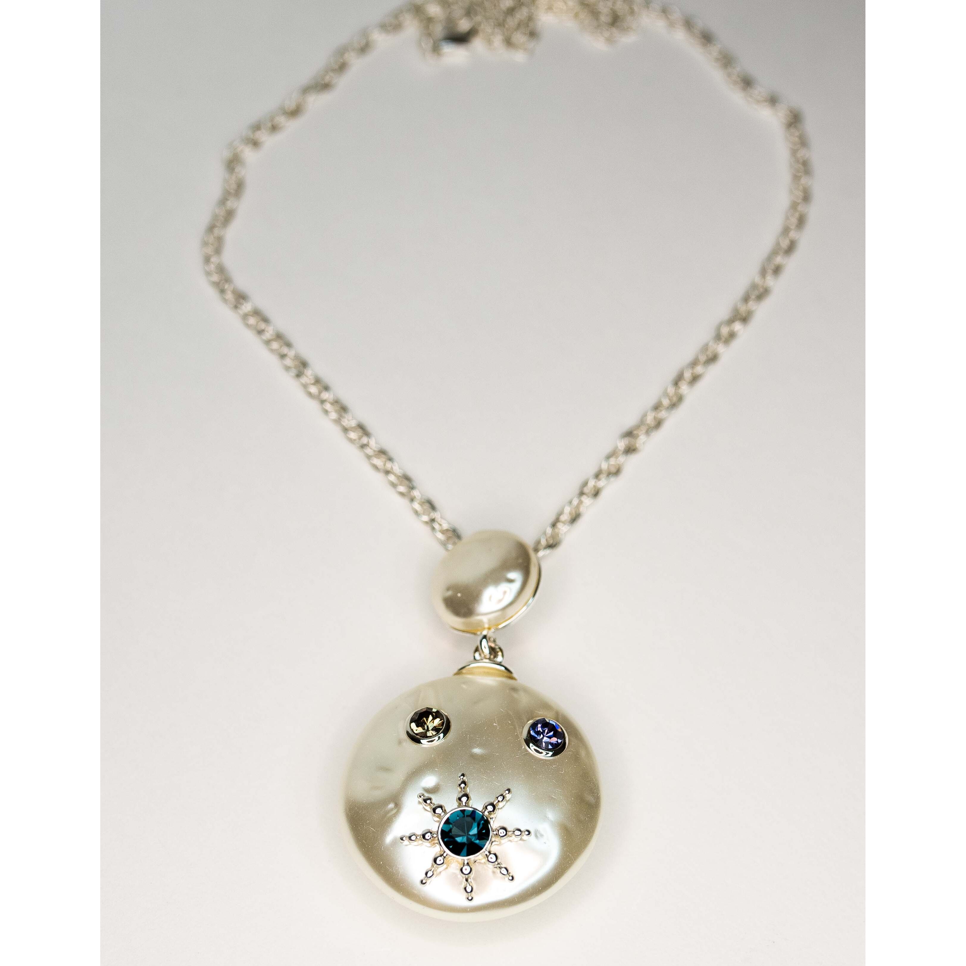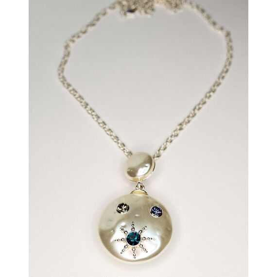 Подвеска (колье) из гипоаллергенного ювелирного сплава серого цвета. Вставка- иск. жемчуг, цвет- белый и ювелирное стекло, цвет-лондон блю, белый, голубой. Высота подвески-5,0см, ширина-3,5см. Длина цепи- 50,0+5,0см, замок- карабин.