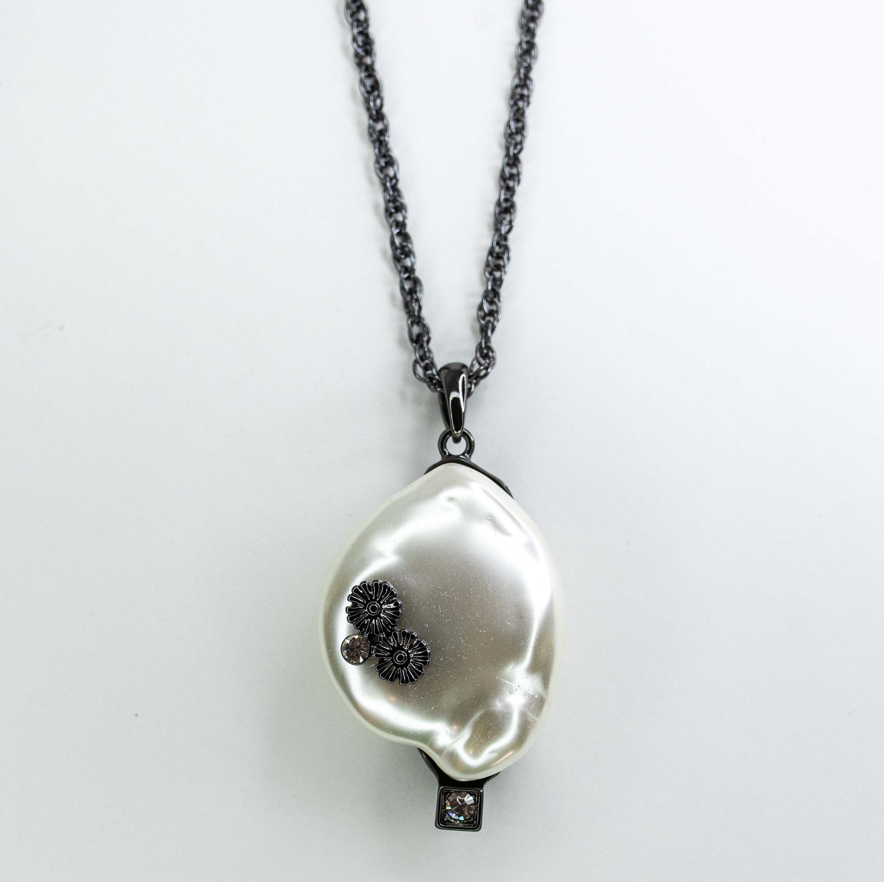 Подвеска ( колье) из гипоаллергенного ювелирного сплава черного цвета. Вставка- ювелирное стекло и иск. жемчуг белого цвета. Высота подвески-5,5см, ширина-3,0см. Длина кордовой цепи-55,0+5см, замок- карабин.