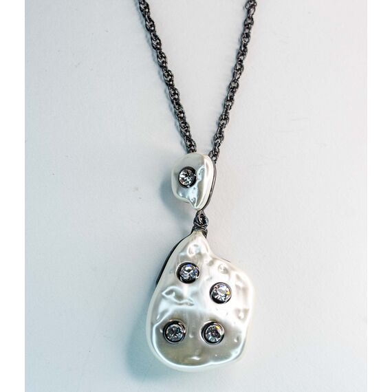 Подвеска из гипоаллергенного ювелирного сплава ,цвет-серый,черный. Вставка-иск.барочный жемчуг белого цвета(размер камня-3,0/4,0см) и ювелирное стекло ,цвет-белый..Высота подвески-6см,ширина-3см. Длина цепи-50+5см,плетение-Кордовая.