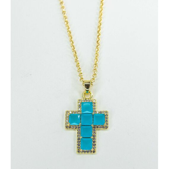 Подвеска из гипоаллергенного ювелирного сплава желтого цвета. Вставка- улексит голубого цвета и ювелирное стекло белого цвета. Высота подвески-4см, ширина-2см. Длина цепочки-50,0+5см. Замок- карабин.