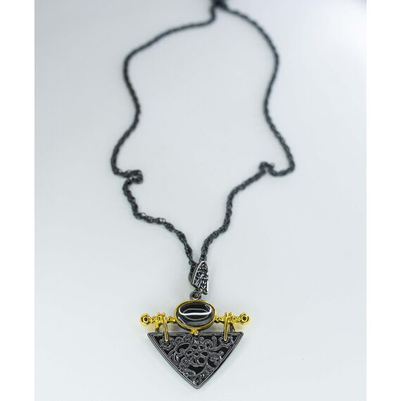 Подвеска ( колье) из гипоаллергенного ювелирного сплава черного и желтого цвета. Вставка- улексит( кошачий глаз) серого цвета. Высота подвески-5,5см, ширина-4,0см. Длина цепи( плетение- кордовое)-55,0см. Замок- карабин.