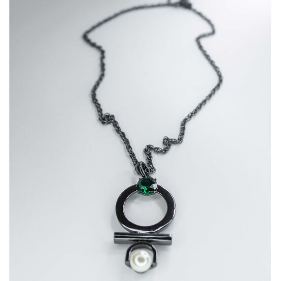 Подвеска (колье) из гипоаллергенного ювелирного сплава черного цвета. Вставка- иск. жемчуг белого цвета и ювелирное стекло, цвет- зеленый. Высота подвески-6,0см, ширина-3,0см. Длина цепи- 55,0см+5,0см, замок- карабин.