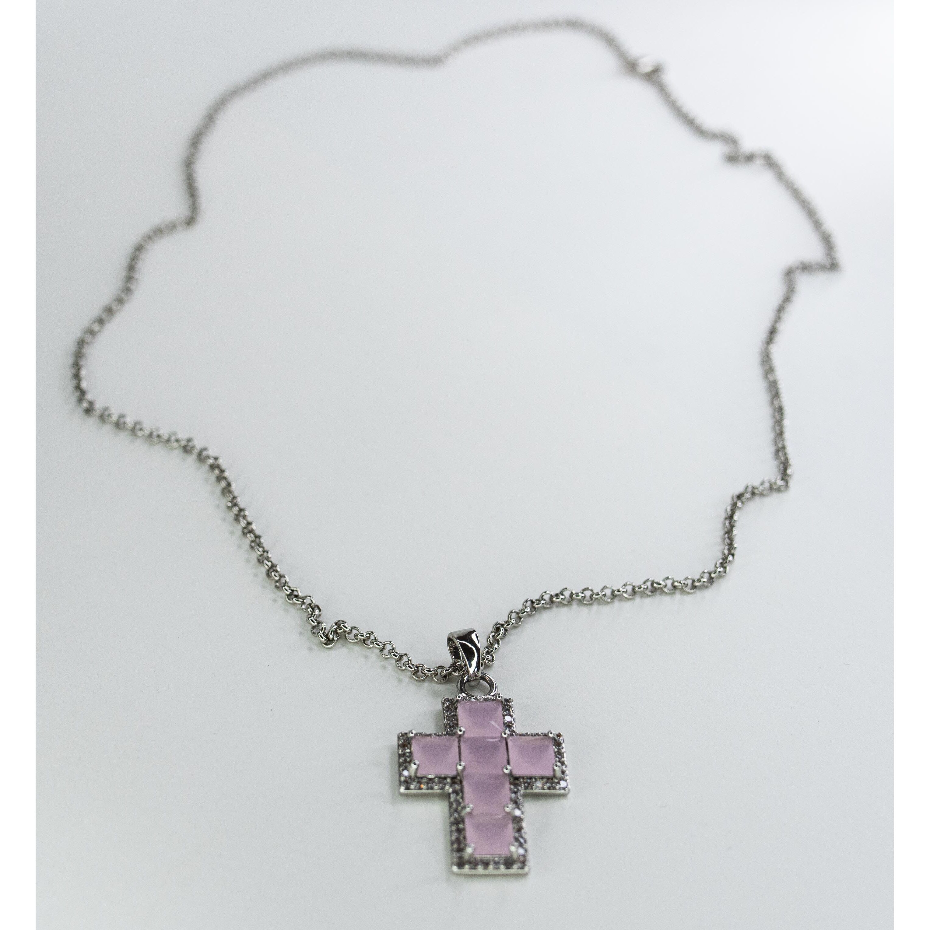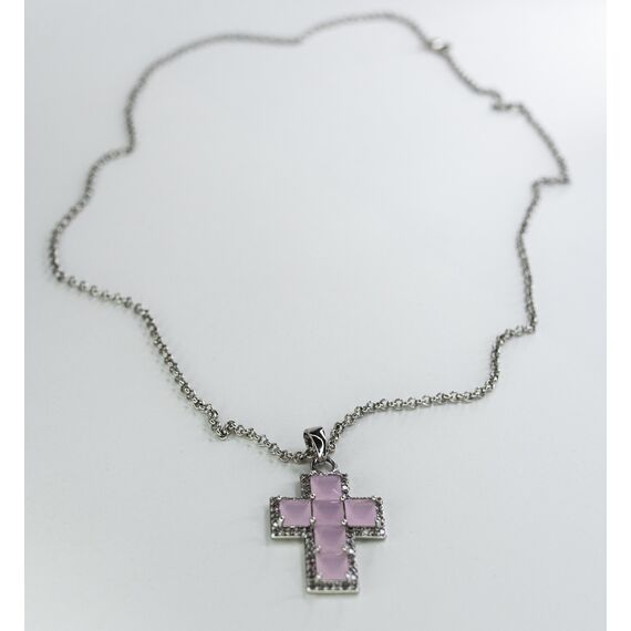 Подвеска из гипоаллергенного ювелирного сплава серого цвета. Вставка- улексит розового цвета и ювелирное стекло белого цвета. Высота подвески-4см, ширина-2см. Длина цепочки-50,0+5см. Замок- карабин.