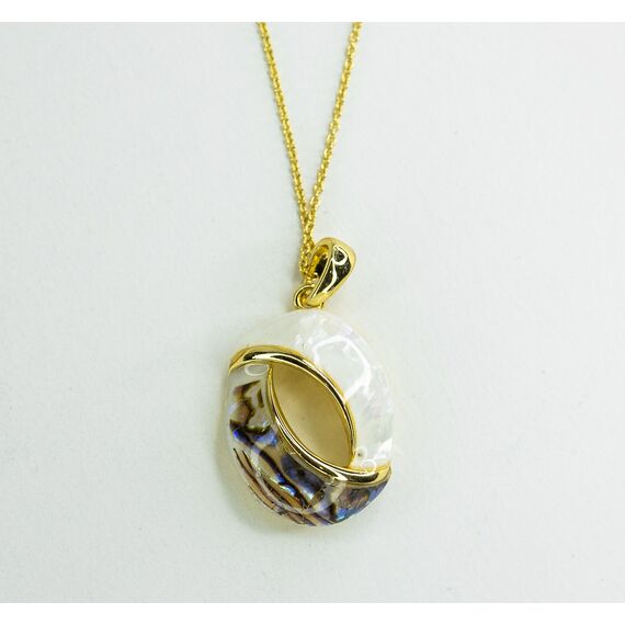 Подвеска из гипоаллергенного ювелирного сплава желтого цвета. Вставка - гелиотис (перламутр), цвет -белый и микс. Высота подвески - 3,5см, ширина - 1,5см. Длина цепи - 45см + 5, плетение - Якорная.