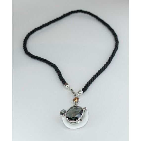 Подвеска (колье) из гипоаллергенного ювелирного сплава серого цвета и текстильного ремешка черного цвета. Покрытие эмалью белого цвета. Вставка- ювелирное стекло, цвет-серый. Высота подвески-5,0см, ширина-4,0см. Длина ремешка- 50,0см+5,0см, замок- карабин.