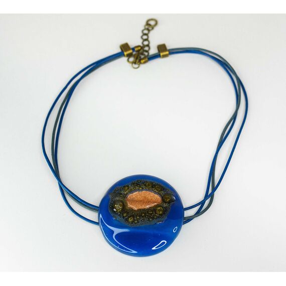 Подвеска (колье) представляет собой подвеску из муранского стекла синего и кирпичного цвета на кожанных ремешках синего цвета. Диаметр подвески-6,0см. Длина колье- 40,0+5,0см, замок- карабин из ювелирного сплава желтого цвета.