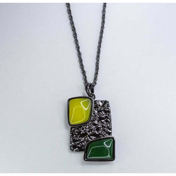 Подвеска ( колье) женская из гипоаллергенного ювелирного сплава черного цвета и эпоксидной смолы, цвет- зеленый и желтый. Высота подвески-5,5см, ширина-3см. Длина цепи (кордовой)-55,0+5см.