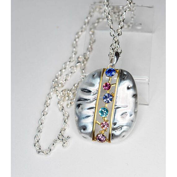 Подвеска из гипоаллергенного ювелирного сплава желтого и серого цвета . Вставка- ювелирное стекло , цвет- синий,розовый. голубой. сиреневый. Высота подвески-5см, ширина-3см. Длина цепи-50см+5, плетение- Якорная.
