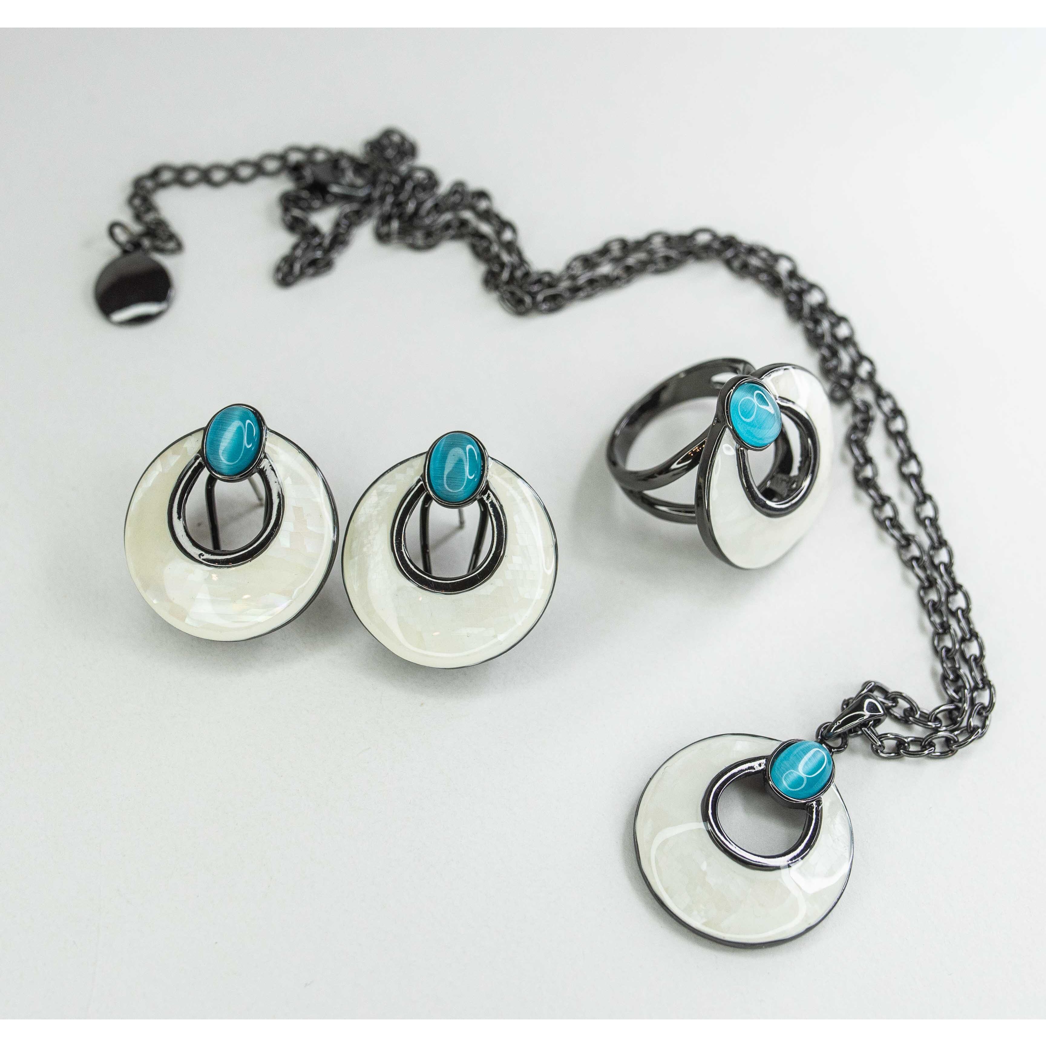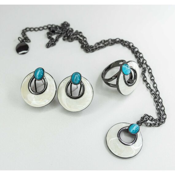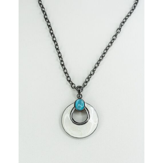 Подвеска ( колье) из гипоаллергенного ювелирного сплава черного цвета. Вставка- улексит голубого цвета и перламутр белого цвета. Высота подвески--4,0см, ширина-3,0см. Длина якорной цепи-55,0+5см. Замок- карабин.