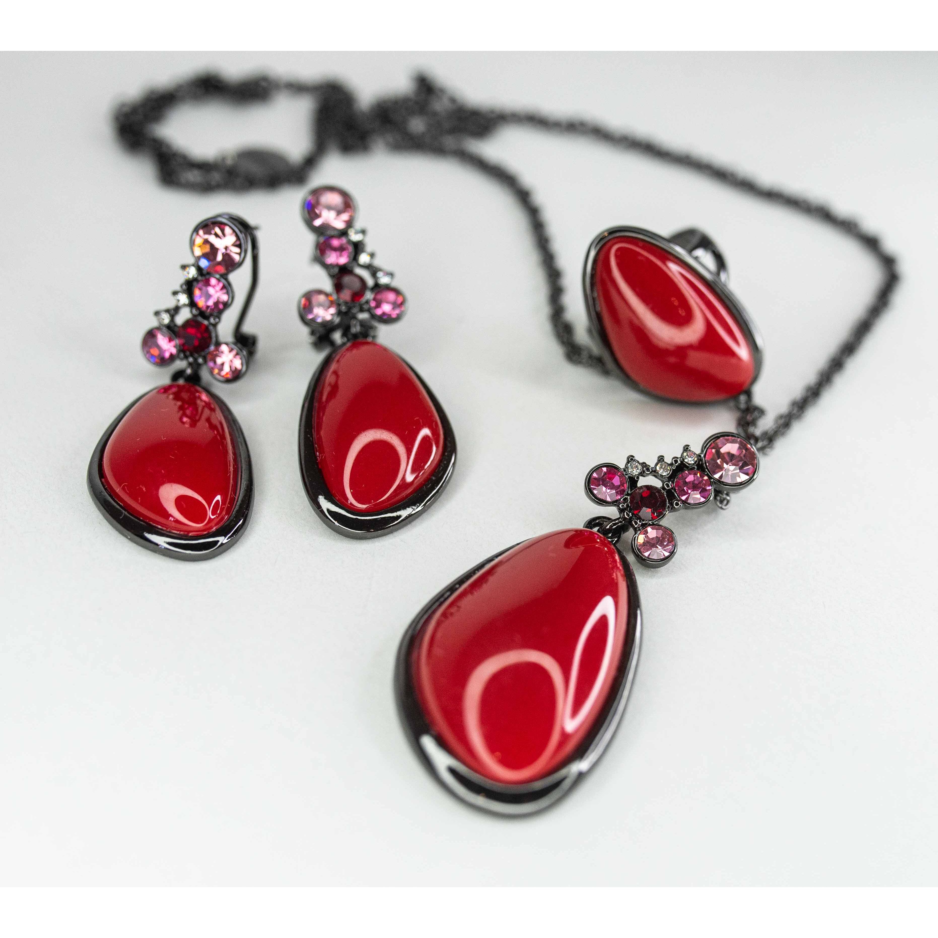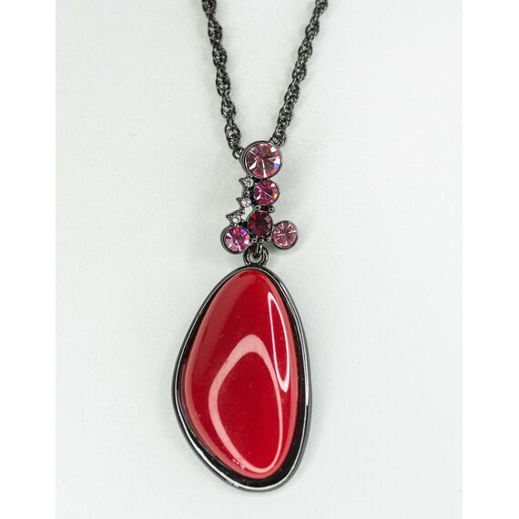 Подвеска женская из гипоаллергенного ювелирного сплава черного цвета. Высота подвески- 7,0см, ширина- 3,0см. Вставка- ювелирное стекло, цвет- розовый и эпоксидная смола, цвет- красный. Длина кордовой цепи-55,0+5см, замок- карабин.