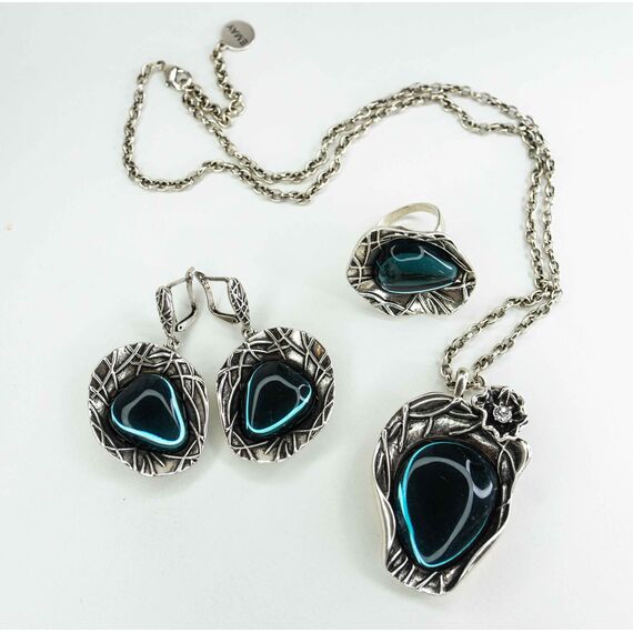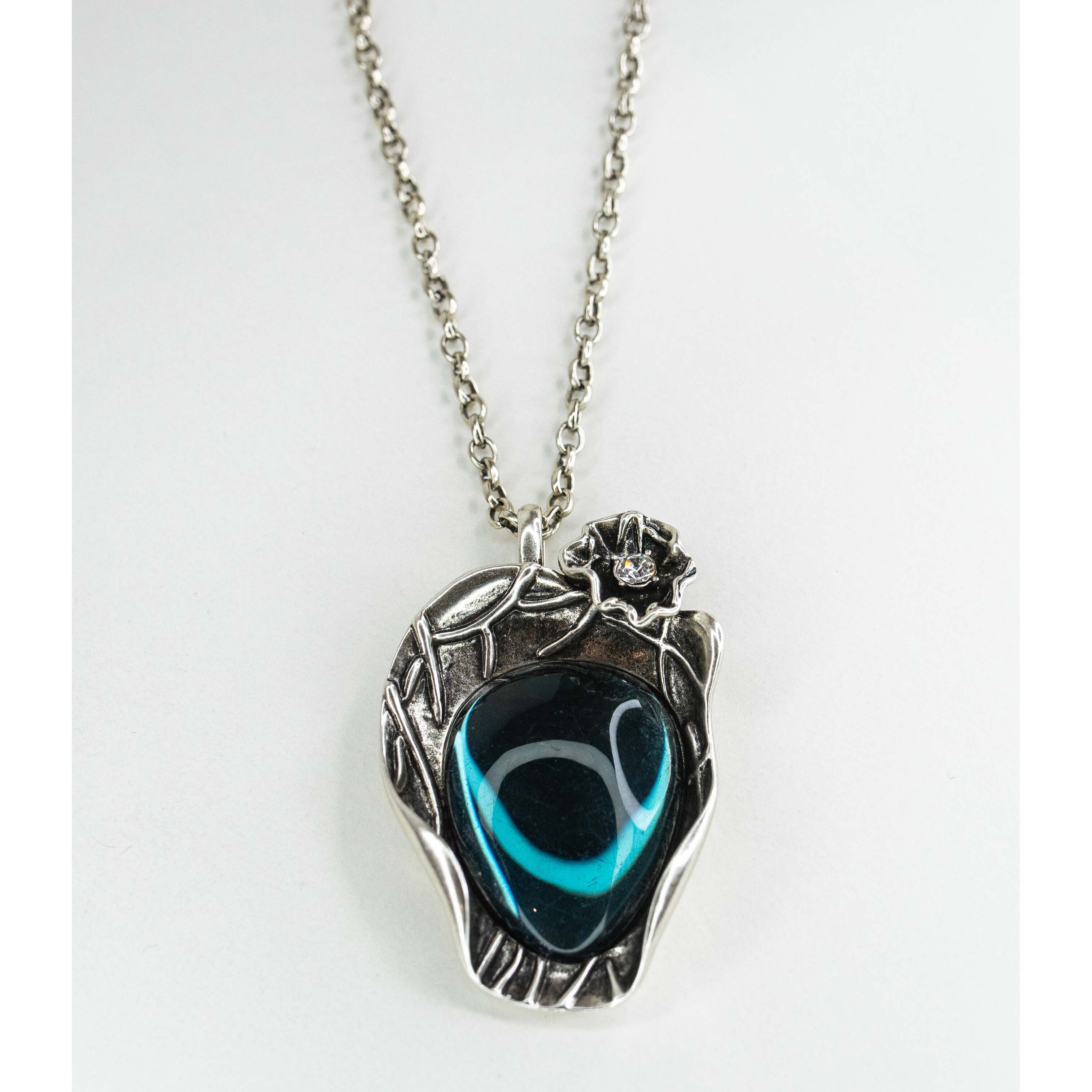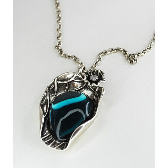 Подвеска женская из гипоаллергенного ювелирного сплава серого цвета. Вставка- улексит( кошачий глаз), цвет- лондон блю. Высота подвески-6,0см, ширина-3,5см. Длина цепи ( ролло)-55,0+5см, замок- карабин.